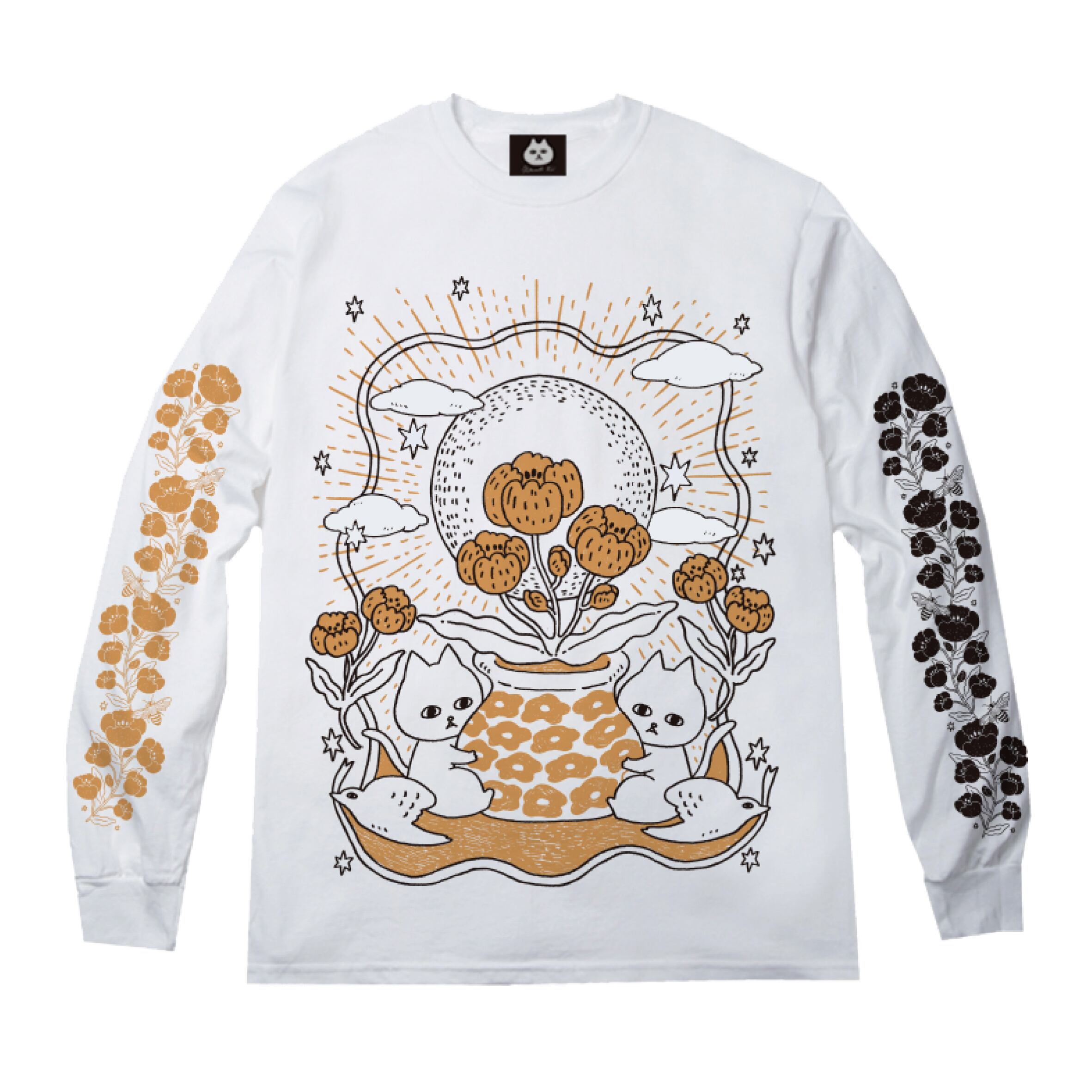 Long sleeve T-shirt printed with an illustration of a round sun and flowers in full bloom.