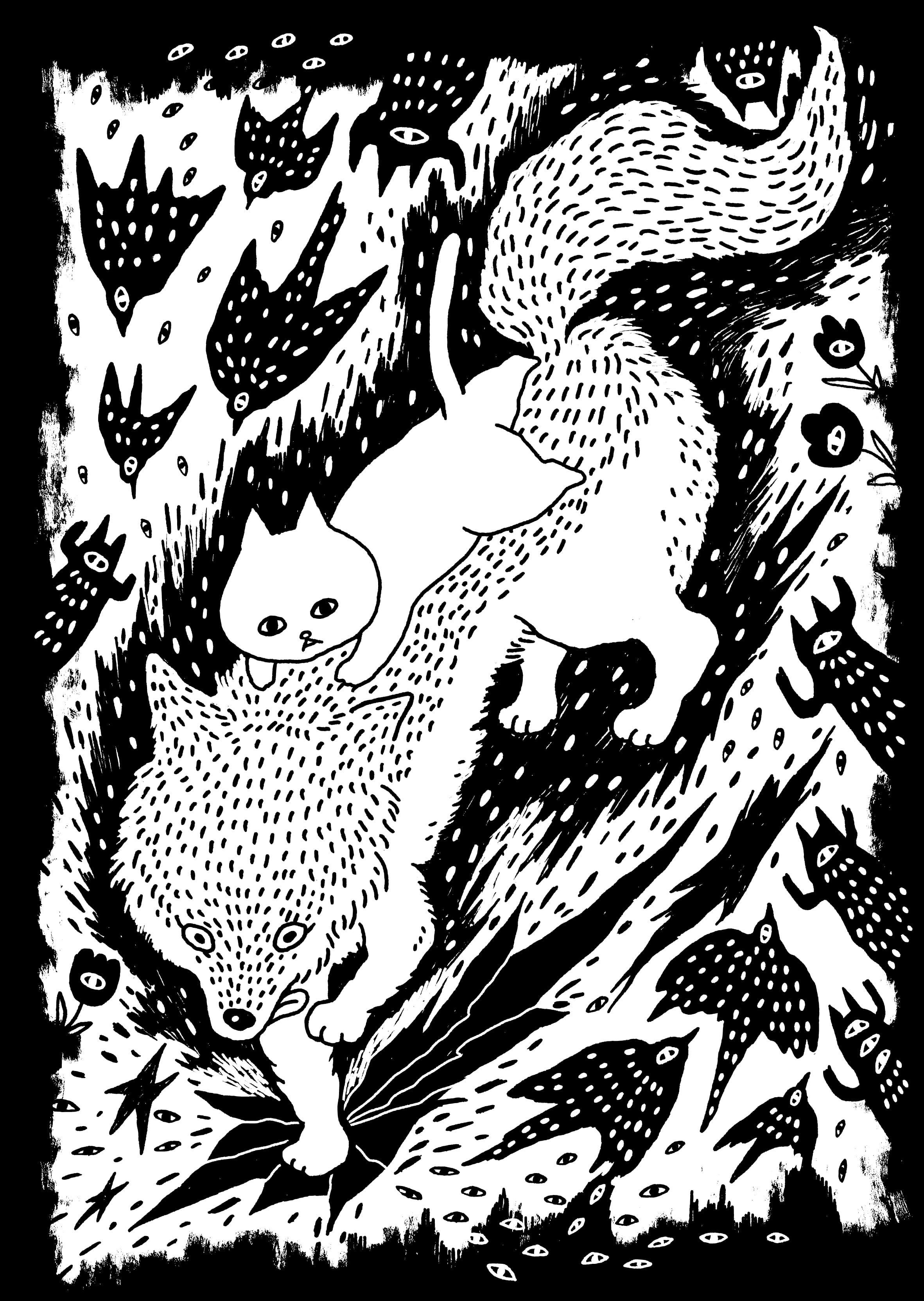 This is a long-sleeved T-shirt printed with illustrations of wolves and cats.